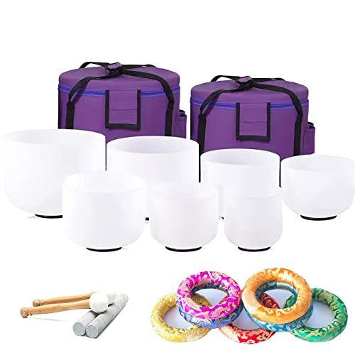 Crystal Singing Bowl Set - White Frosted Series, 432/440hz Set med 7 st, 2 st Bärväska, 7 st Silk Brocade Kudde,För ljudläkning och terapimeditation (Color : 432 hz 6-12inch 7pcs)