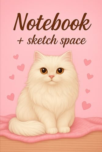 Notebook + Sketch Space – 241 pages: White cat with big round eyes on a pink background with hearts