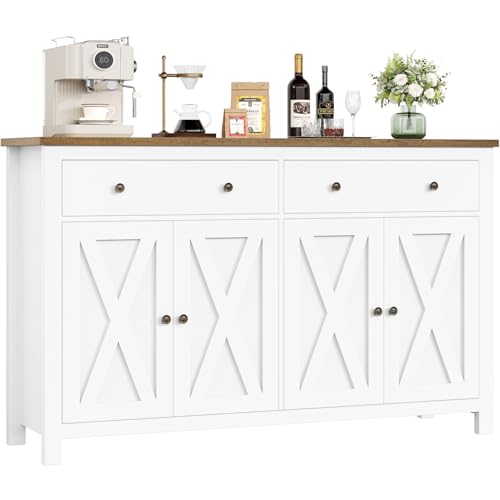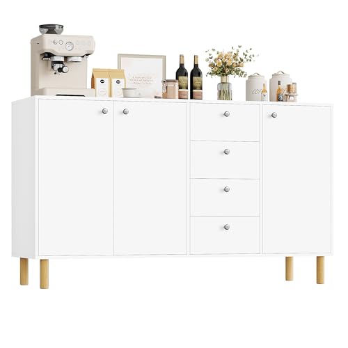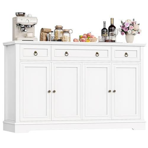 FirFurd Köksskåp för sidobord, vitt sidobord, stort bufféskåp med 3 lådor, 4 dörrar, justerbar hylla för vardagsrum, matsalsmöbler 134 x 40 x 87 cm