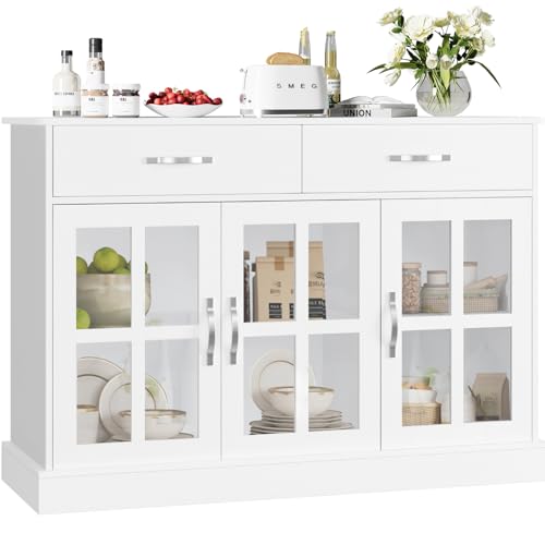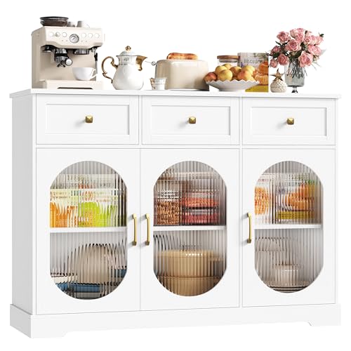 FirFurd Skänk 120 cm brett köksskåp med bänkskiva skänk för kök vardagsrum bufféskåp med 3 lådor och 3 glasdörrar köksbuffé med justerbar hylla vit 120 x 89 x 39,8 cm