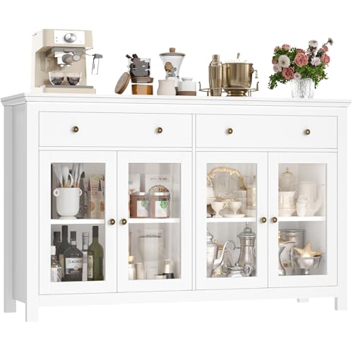 FirFurd Skänk 140 cm brett köksskåp med bänkskiva skänk för kök vardagsrum bufféskåp med 2 lådor och 4 glasdörrar köksbuffé med justerbar hylla vit 140 x 90,7 x 40 cm