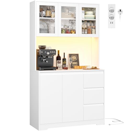 FirFurd Köksskåp, bufféskåp med LED-skänk, för kök med grenuttag, köksskåp med bänkskiva och 3 lådor, köksbuffé med justerbar hylla, 180 x 100 x 38,5 cm, vit