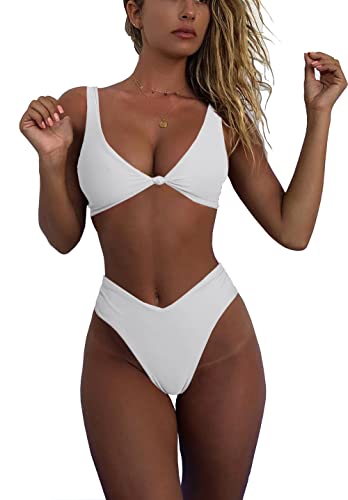 geluboao Two Piece White Bathing Suits for Women High Waisted V Neck Swimsuits Solid Knot Front Push Up Cheeky High Cut Thong Bikini Set XL