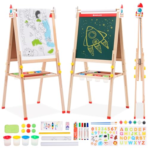 Barnens staffli målning dubbelsidig tavla för barn med krittavla & whiteboard höjd justerbar stående tavla med pappersrulle målartillbehör förvaringsbricka klistermärken för pojkar från flickor 3 4 5