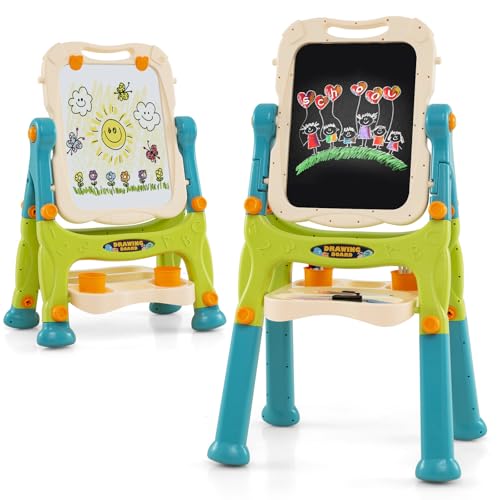 COSTWAY tavla för barn, dubbelsidig barntavla justerbar höjd med whiteboard och krittavla, stående tavla barn, magnettavla från 2 år (grön blå)