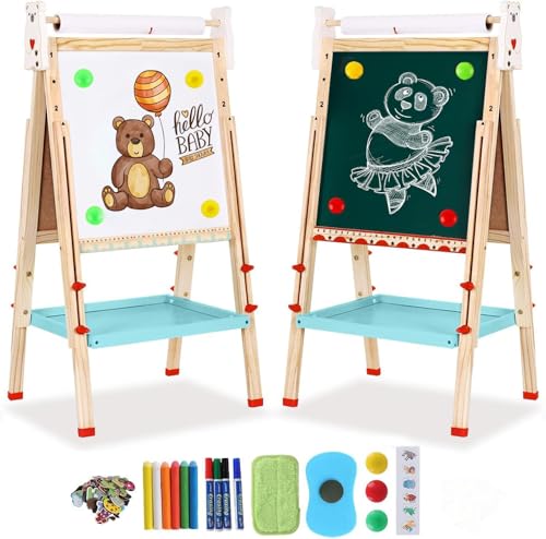 2-i-1 barn träkonst staffli dubbelsidig justerbar stående stor skrivning och ritning whiteboard och tavla med magnetiska tillbehör för barn pojkar flickor