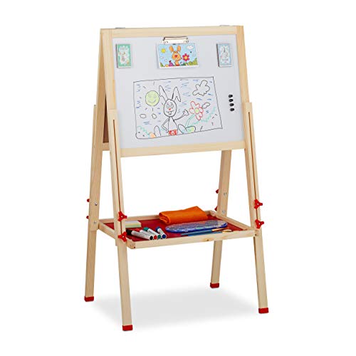 Relaxdays Golvtavla barn, whiteboard och krittavla, höjdjusterbar, stativ trä, 102–135 x 55 x 52 cm, natur, ljusbrun, vit, mörkgrön