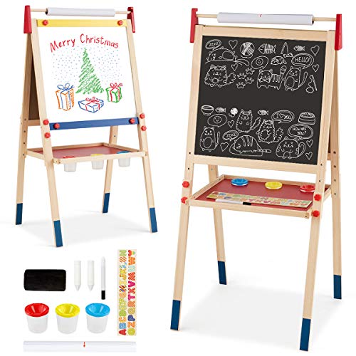 COSTWAY 3 i 1 barn staffel, dubbelsidig justerbar krittavla & whiteboard, stående konst staffel, massivt trä ram, trä staffel för småbarn, med pappersrullar, djärva kritor och andra tillbehör