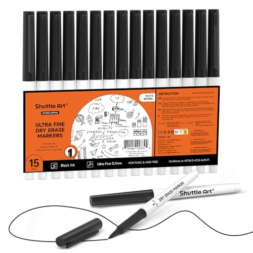 Shuttle Art Ultra Fine Tip Whiteboard-pennor, 15-pack svarta whiteboardmarkörer raderbara, 0,7 mm filtspets torrtorka markörer för att skriva på whiteboards, whiteboardtavlor, planerare för skola