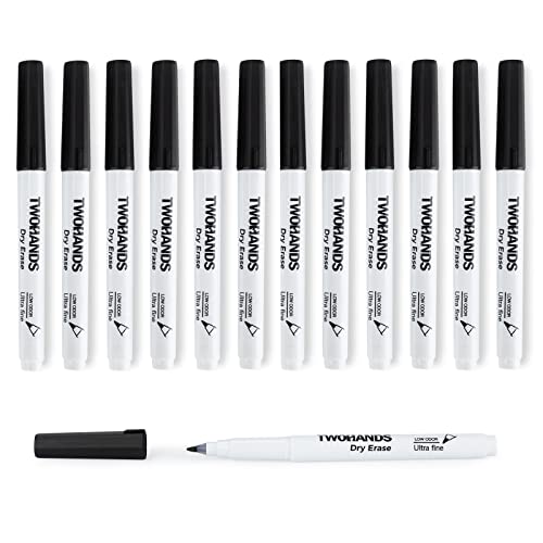 TWOHANDS Dry Erase Markers Ultra fin spets, 0.7mm, låg lukt, extra fin punkt, svart, whiteboard pennor för kontor, hem eller planering whiteboard, 12 räkningar, 20536