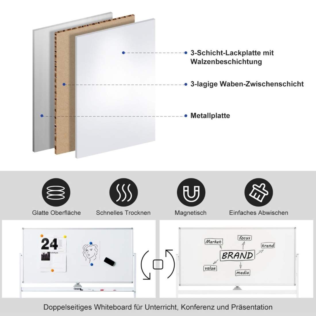 Magnetisk dubbelsidig whiteboardtavla med hjul för klassrummet på kontoret och hemma