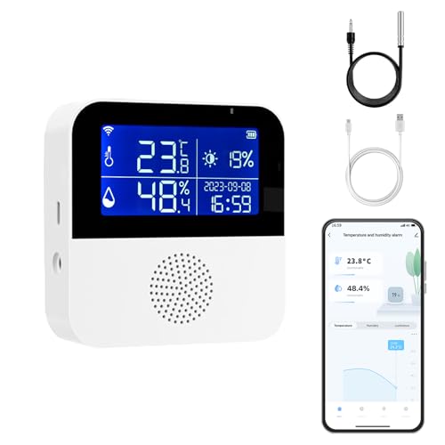 WiFi hygrometer termometer sensor: Smart temperaturfuktighetsmätare, med fjärrkontroll och TUYA APP-aviseringsvarning, hög precision inomhustermometer ingen hubb krävs, fungerar med Alexa (1-pack)