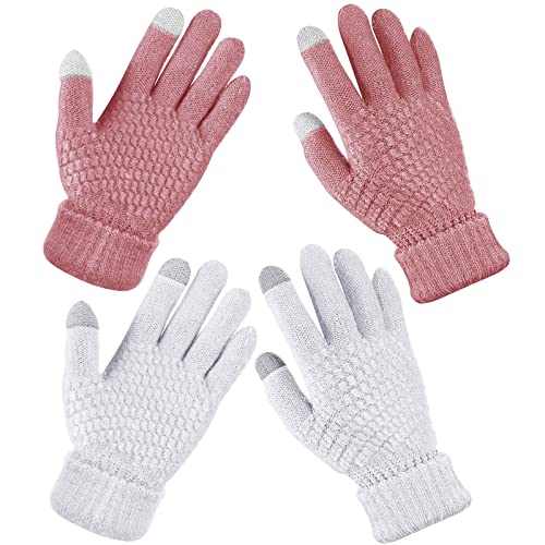Geyoga 2 Pairs Women's Winter Touch Screen Gloves Soft Warm Fleece Lined Knit Elastic Cuff Winter Texting Gloves(White, Pink)