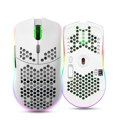 Wireless Gaming Mouse, 2.4G Lightweight Honeycomb Shell Ergonomic RGB Mice with 750mAh Rechargeable Battery, Energy Saving, 6 Buttons & Mini USB Receiver for Windows, Mac OS, Laptop, Smart TV(White)