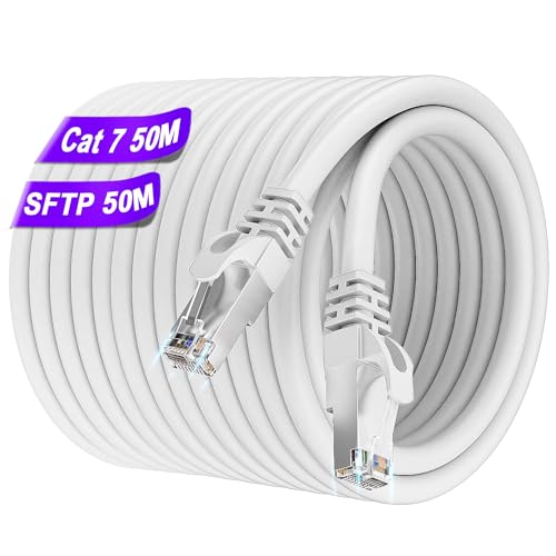 Soibke LAN-kabel 50 meter, nätverkskabel 50 m Cat 7, Wlan-kabel 10 Gbps 600 MHz skärmad S/FTP Ethernet vit höghastighets utomhuspatch Gigabit RJ45 Internet för router modem