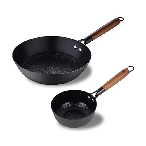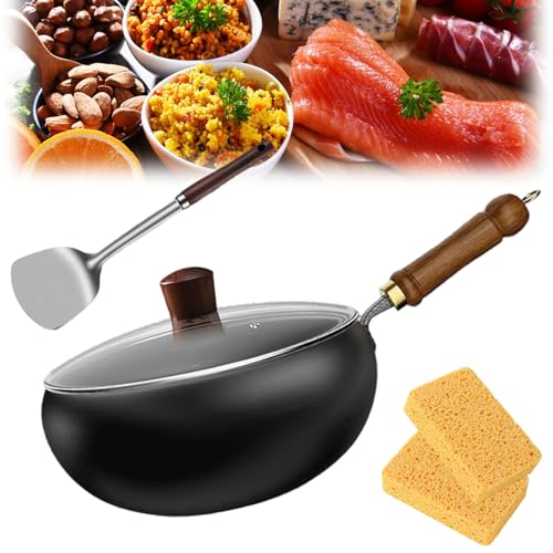 Desouwell Järnpanna, japansk järnpanna med trälock, 24 cm/28 cm obelagd järnpanna, behållare av hög renhet järn, handsmidd non-stick belagd wok (28 cm glaslock)