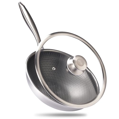 4BIG.fun wok stekpanna i rostfritt stål 36 cm nonstick bikakestruktur wokpanna med glaslock Asia gryta ugnssäker induktion