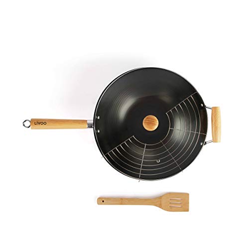 Soppade recept kolstål wok för elektrisk, induktion och gasspisar (lock, spatel och användarhandbok video ingår)