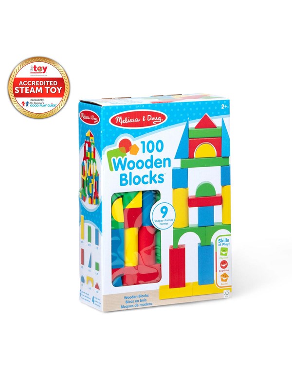 Melissa & Doug Wooden Building Blocks Set - 100 Blocks in 4 Colors and 9 Shapes