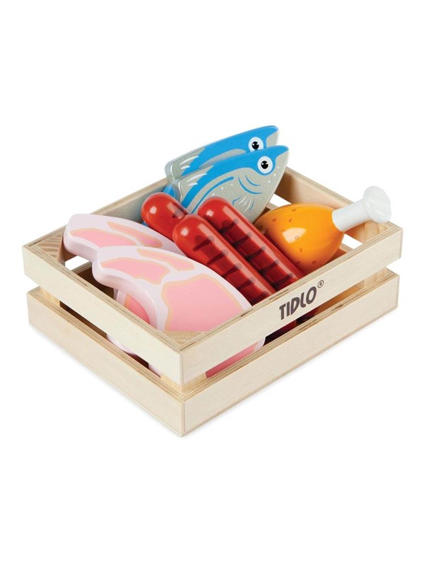 Tidlo Wooden Play Food Meat and Fish in Box 8 pieces.