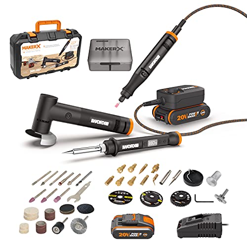 WORX 18V(20V MAX) 3-Tool MakerX Combo Kit WX991, PowerShare, Rotationsverktyg+Trä- och metallhantverkare+Vinkel Emeriler, 1 Batteri ingår, 48st Tillbehör Kit ingår