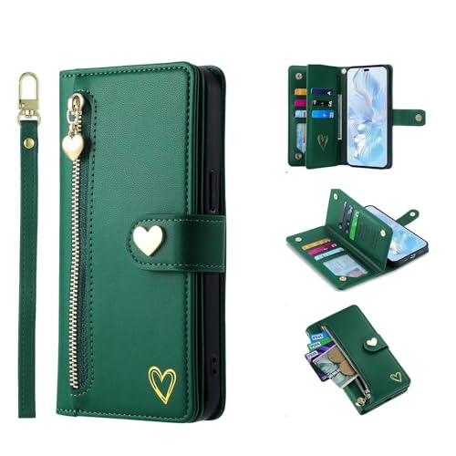 WOWUDI för Xiaomi 14T Pro 5G dragkedja telefonfodral med Stativfunktion,korthållare,9 kortplatser,stor kapacitet och sött fashionabelt mönster kärlek Skyddsfodral- grön