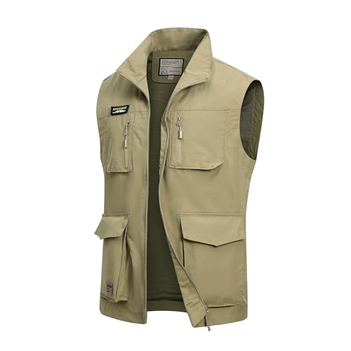 MeiLayM Väst för män, herrväst för utomhusbruk, lätt sommarväst med flera fickor, ventilerande och snabbtorkande väst, topp, nyttoväst i plusstorlek för arbete, resor, fiske, jakt, fotografering, camping, Khaki, XL