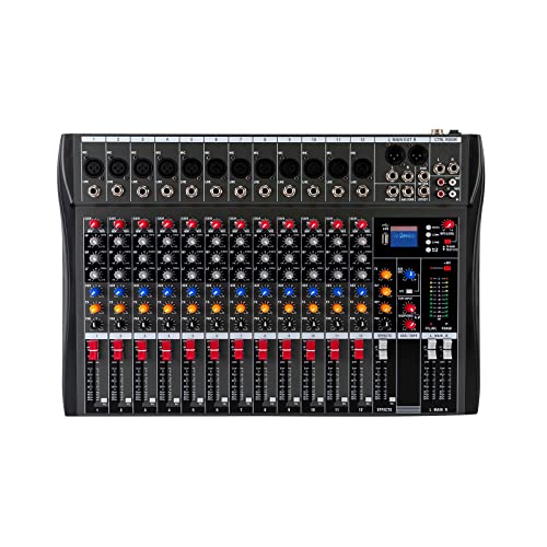 Blandare professionell mixer, 12-kanals studiomixer med XLR-mikrofonbas, 48 V fantommatning, med Bluetooth, realtidsövervakning, DJ-ljud-styrenhet