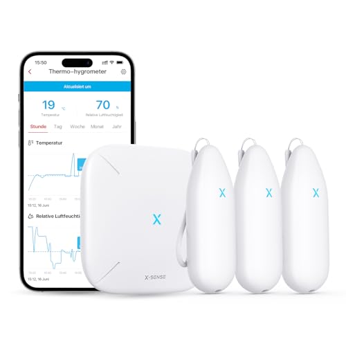 X-Sense WLAN-hygrometer termometer inomhus, temperatur- och fuktighetsövervakning via app, export lagrade data, kompatibel med Alexa, 3 sensorer – kräver basstation SBS50