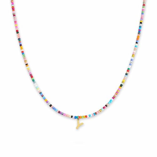 Färgglad pärlhalsband dam | Vattentåligt halsband med bokstaven Y | Initialberlock i 18K guldpläterat rostfritt stål | Hudvänligt och justerbart halsband (40–