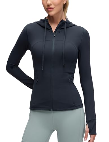 CRZ YOGA Kvinnors Butterleuse Full Zipper Löpning Jacka Zip Väska Sport Gym Hoodie Mesh Hoody Sweatjacka med tumhål Sann marin M
