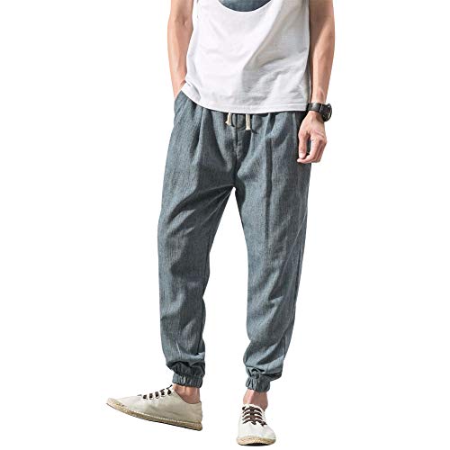 Vanvene - Linnebyxor för män, linne och bomull, lätta säckiga, säckiga strandbyxor, yoga, breda ben, Blå, 4XL