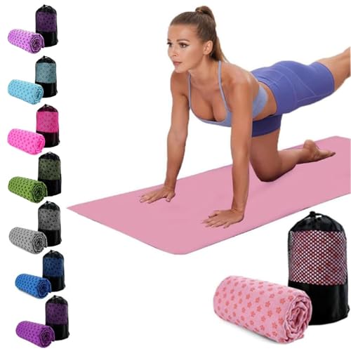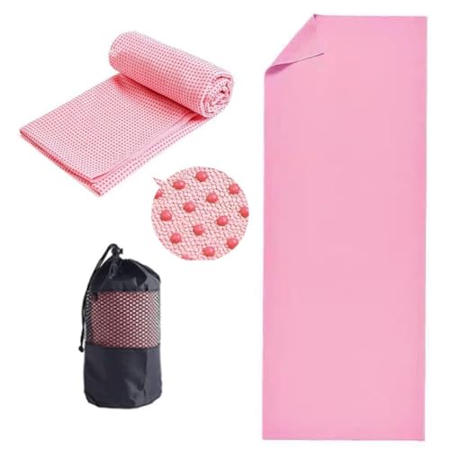 Halkfri yogamatta handduk med nätväska, 183 cm x 63 cm mikrofiber matta yogamatta med grepppunkter för heta yoga pilates bikram (rosa)