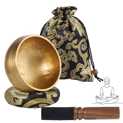 Ajuny tibetansk sjungskål set – handgjord meditation mässing ljudskål med pinne och kudde för yoga, chakra-läkning, mindfulness och stresslindring andliga gåvor – guld rödbrun