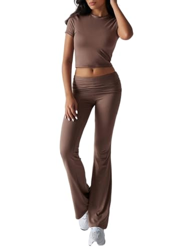 2 Piece Lounge Sets for Women Fold Over Flare Pants Short Sleeve Crop Top Y2k Outfits Yoga Clothing Matching Set Tracksuit(Coffee,XS)