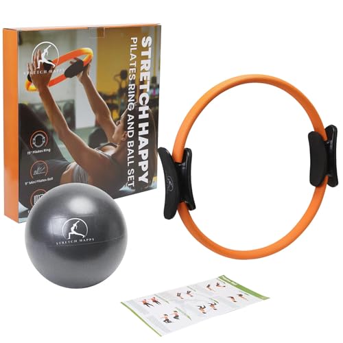Stretch Happy Pilates ring och boll utrustning set – yoga fitness magisk cirkel och miniboll. GRATIS guide. Motståndsträning, muskeltoner, bäckengolvstränare, mag- och lårstärkare hemma.