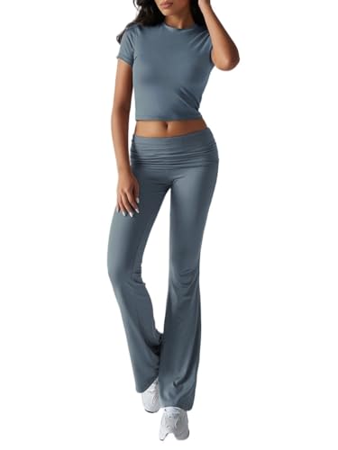 2 Piece Lounge Sets for Women Fold Over Flare Pants Short Sleeve Crop Top Y2k Outfits Yoga Clothing Matching Set Tracksuit(Grey blue,XS)