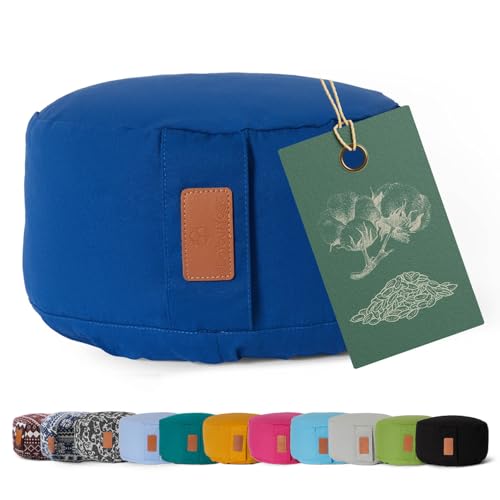 Lotuscrafts Yogakudde, meditationskudde, extra låg – sitthöjd 10 cm – tvättbart överdrag av bomull – yoga sittdyna med dinkelfyllning – GOTS-certifierad (blåklint)