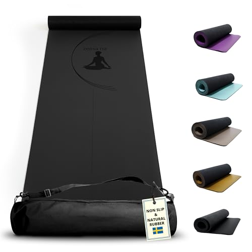 Zeesa Na Premium Yogamatta Halkfri, Hot Yoga Mat med Yogamatta Väska, Hållbar Vegan Träningsmatta i Naturgummi, 4mm Tunn Yoga Matta med Enastående Dämpning - Även för Pilates och Bikram, Svart