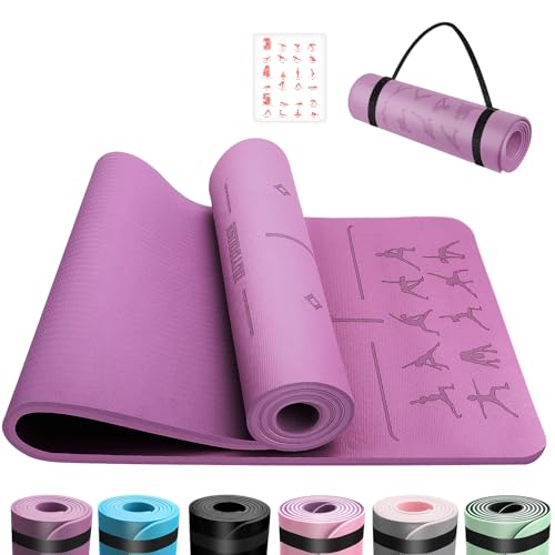 Good Nite yogamatta träningsmattor träning pilates fitnessmatta för kvinnor män halkfri tjock 6 mm hög densitet gymnastikmattor med bärrem Tpe 183 x 61 x 0,6 cm (lila/rosa)