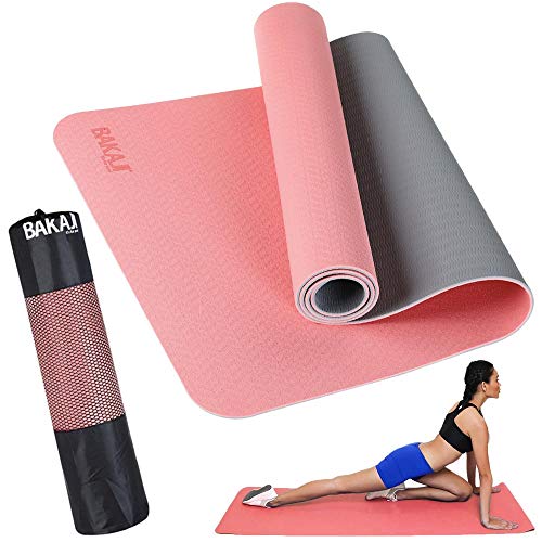 BAKAJI Miljövänlig TPE Yogamatta Dubbelskikt Halkfri Hög Densitet Madrass Träningsmatta Fitness Aerobics Gymnastik Storlek 180 x 61 cm med Fodral (Rosa/grå)