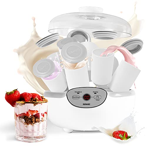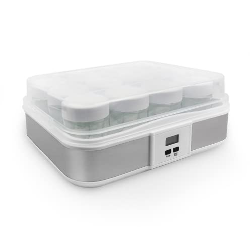 Leogreen - Yoghurtmakare, maskin för naturlig yoghurt, 12 burkar, med timer, 30,6 x 25 x 12,4 cm, vit, kapacitet per kruka: 0,21 l, inställning av timer: 0-15 timmar