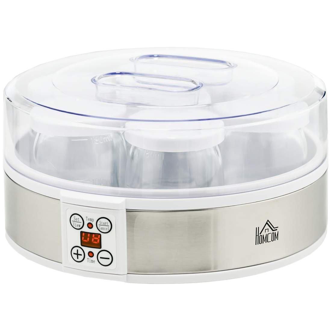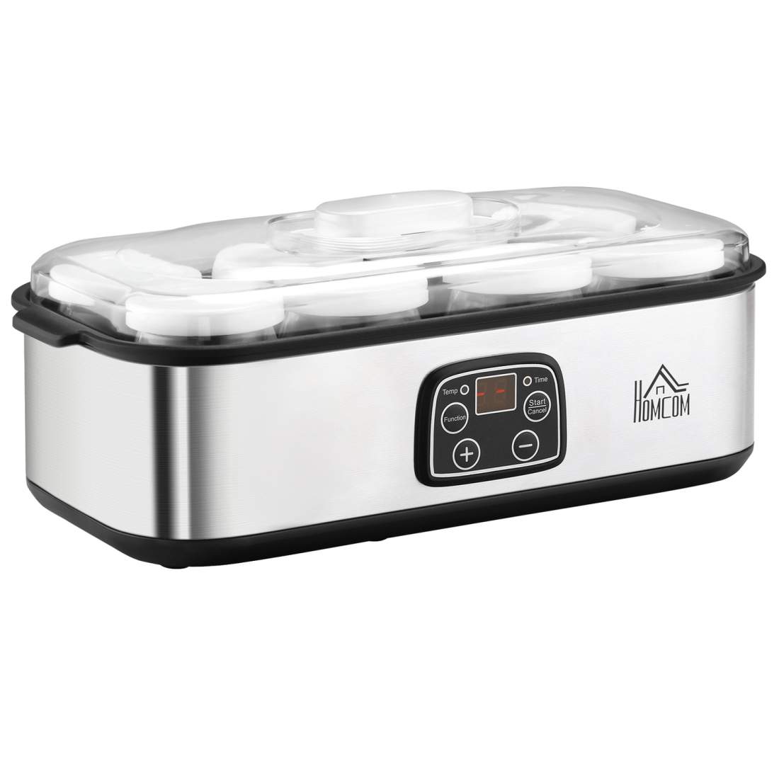 HOMCOM Yoghurttillverkare med 8 glasburkar på 180 ml, elektrisk yoghurtmaskin i rostfritt stål med timer, justerbar termostat och digital display för hälsosamma hemdesserter