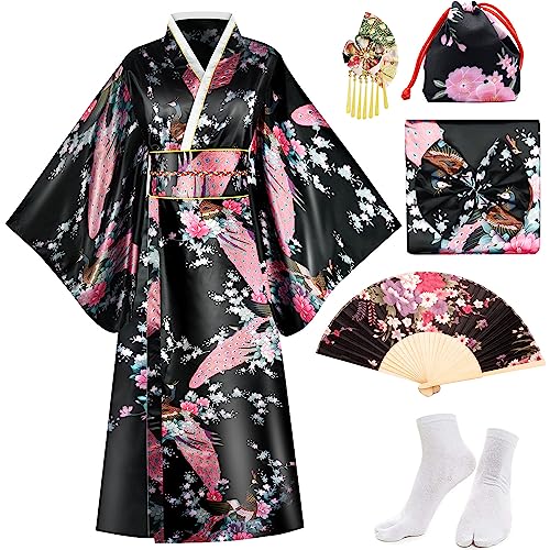 PLULON 5 st japansk mantel Geisha Yukata klänning blomma satin badrock med dragsko handfläkt gaffel tabi strumpor set, svart, one size