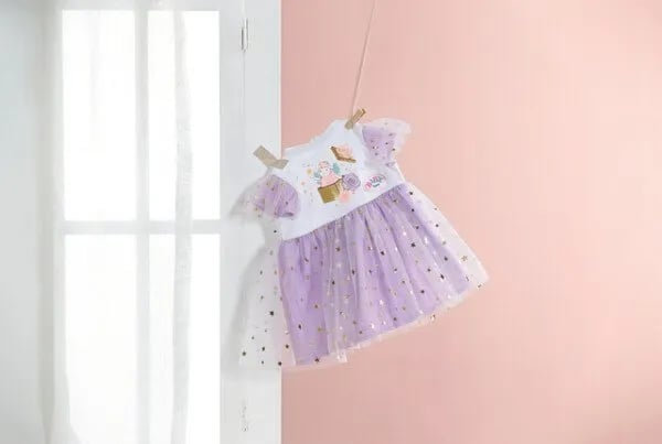 Zapf Creation 828243 Baby född klänning 43 cm i rosa eller lila inklusive klädhängare, 1 klänning, färg efter lager och inte fritt valbar