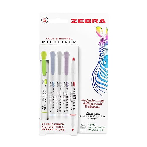 Zebra Pen Mildliner Double Ended Highlighter, Broad and Fine Point Tips, Assorted Cool and Refined Ink Colors, 5-Pack, multicolor, 2690