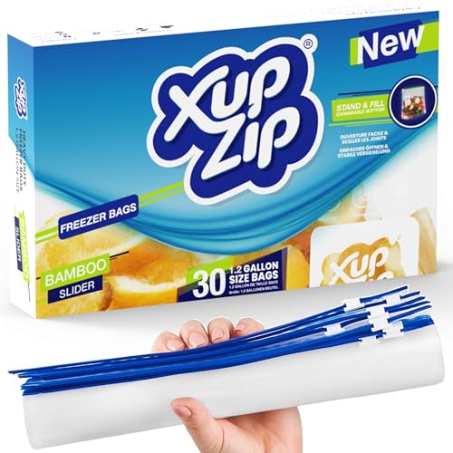 Livsmedelsförvaring frysväskor av XupZip™ | Kraftiga skjutreglage Ziplock-väskor | Lufttäta smarta påsar med utdragbar botten | stativ och fyll i BPA-fria matförvaringsväskor – 30 x gallon matväskor