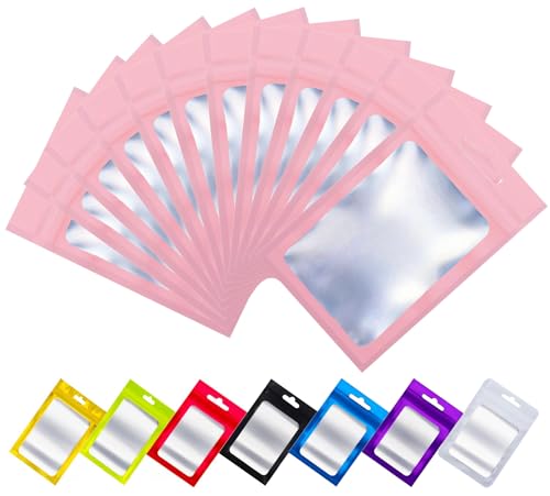 Rimiko 100 st Mylar Zip Påsar med Genomskinligt Fönster, Lufttät Zip Påse med Hängande Hål, Återförslutbar Ziplock-Påse av Aluminiumfolie för Förpackning och Matförvaring (Rosa, 7,5x12 cm)