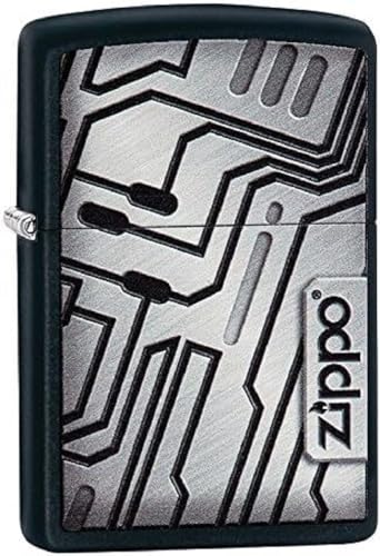 Zippo Stormtändare, matt svart (Black Matte), med 360°-lasergravyr av geometriska linjer, påfyllningsbar och återanvändbar, med vindskyddad design, presentförpackning, tillverkad i USA