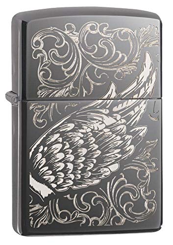 Zippo stormtändare - Wings, änglafjädrar, Black Ice-finish, svart lasergravyr, återanvändbar, vindskyddad, presentförpackning, tillverkad i USA
